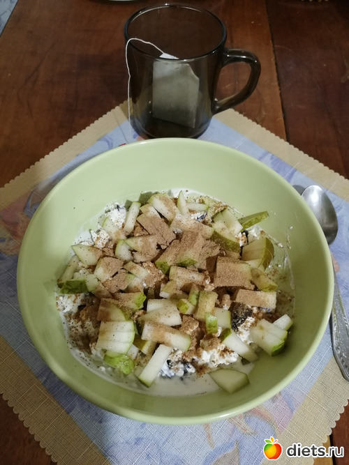 Творог с черносливом и грушей, заправляла сметаной и поспала корицей (сахар не добавляю), зелёный чай.