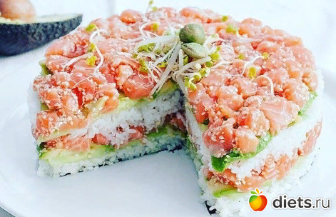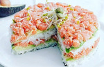Этот салат подходит для любого праздника. Интересен этот рецепт тем, что ингредиенты схожи с теми, которые нужны для приготовления суши, и по вкусу салат напоминает именно их.