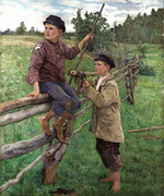 Рыжая голова приподнялась над забором, затем на нем появилась нога, потом туловище. Через мгновение рыжий мальчишка спрыгнул с забора вниз и, озираясь по сторонам, пошел к Сереже.