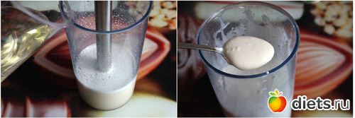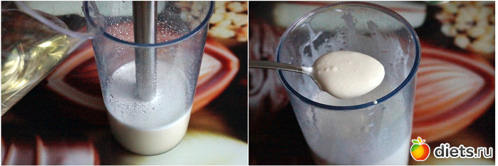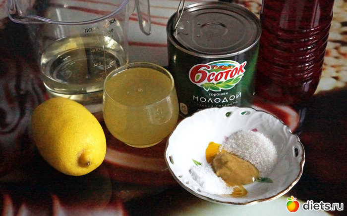 Готовить майонез будем с помощью погружного блендера. В высоком стакане от блендера смешиваем рассол от горошка, соль, сахара, уксус, горчицу, слегка взбиваем. Теперь, не переставая взбивать постепенно вливаем растительное масло, сначала наливаем 150 мл., взбиваем минуты 3-4, далее смотрим по густоте, если хотите более густой соус, до добавляем еще масла и взбиваем. Хранится такой соус отлично до 10 дней в холодильнике.