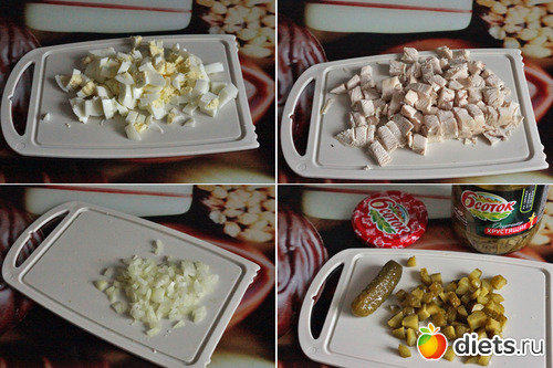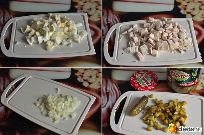 Все продукты режем кубиком размером примерно по 0,5 см.