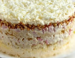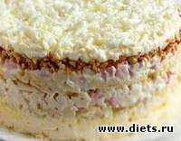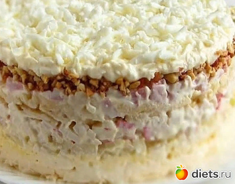 Каждый слой смазать майонезом (кроме последнего) и присыпать мелко порубленными орехами (их желательно предварительно обжарить). Украсить по желанию. Дать пропитаться ~ 2 ч.