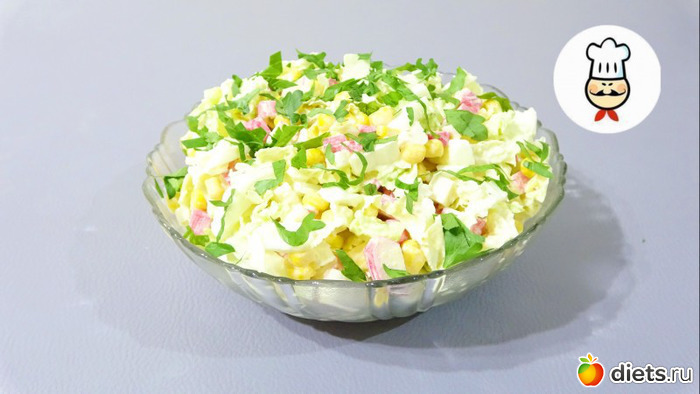 Крабовые палочки нарезать на небольшие кусочки. Добавить к капусте.