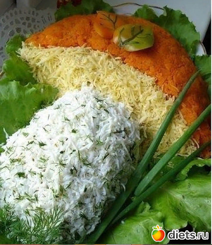 3. Выложить на блюдо, придав форму грибочка, ножку оформляем тёртым на мелкой тёрке белком (присыпать укропом), шляпку-варенная морковь потёртая на мелкой тёрке, низ шляпки - тертый сыр.
