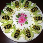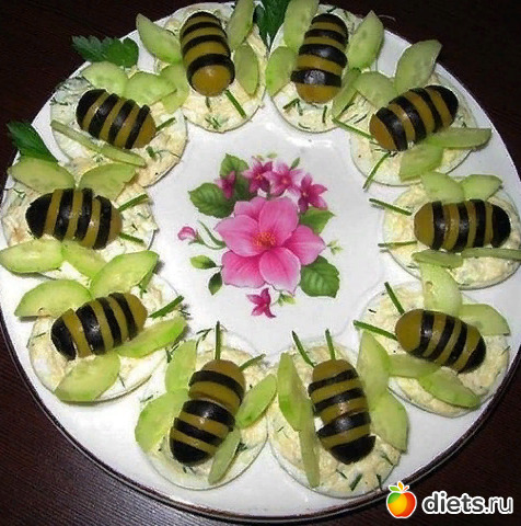 Темные и светлые оливки без косточек одинакового размера нарезаем кружочками поперек. Чередуя разноцветные кружки, выкладываем их на яйца и составляем «пчёлку».