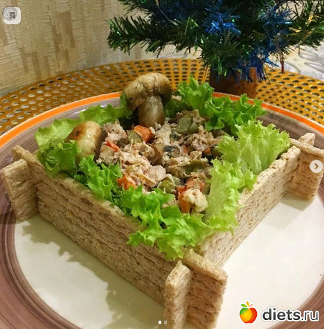 Готовим: Подготовим «забор» из хлебцев. Для этого аккуратно тонким ножиком вырежем отверстия, как показано на фото, и соберём забор. Для салата отварим куриное мясо, морковь. Грибы нарежем небольшими пластинками и обжарим на растительном масле. Отварную курицу и морковь, соленые огурцы режем кубиками, добавляем горох, заправляем майонезом. Готовый салат выкладываем внутрь забора, украшаем зеленью. И... готово!