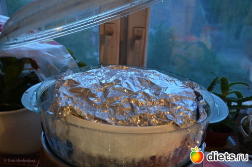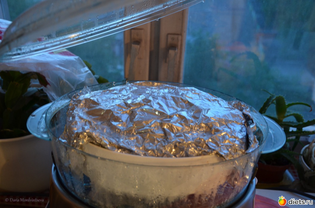 Все это перемешиваем миксером, как при приготовлении обычной шарлотки. Емкость для приготовления рисом выстилаем фольгой и выливаем туда всю массу, накрыв после этого фольгой.