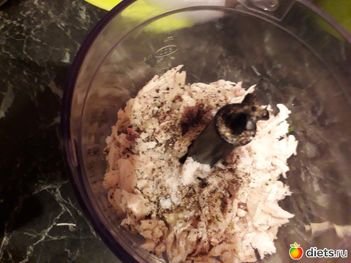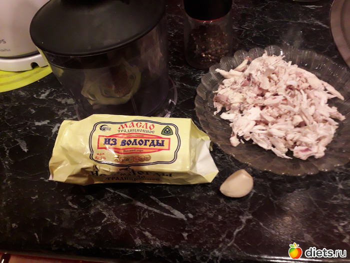 В чашу блендера кладем отварное куриное мясо и чеснок, мягкое сливочное масло, перец, соль и хорошо перебиваем блендером до однородной массы