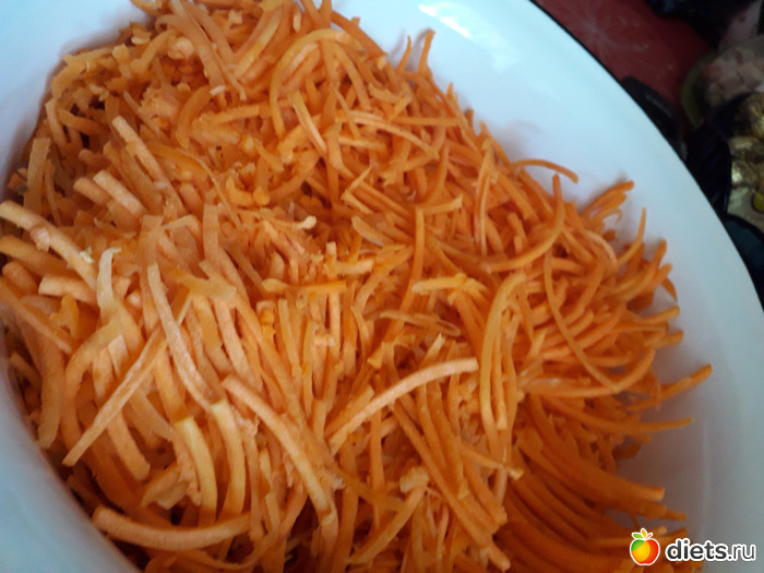 Натереть морковь на терке для корейской морковки. Добавить сахар и соль, хорошо перемешать. Под действием сахара и соли морковь пустит сок, его можно слить, но я всегда оставляю, так морковка более сочная.