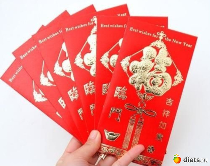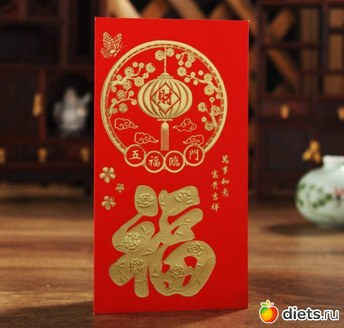 Хунбао продаются обычно упаковками по 10 штук, потому что 1-2 никто не дарит. На них написаны какие-нибудь банальные поздравления или символ года (на день рождения и свадьбы тоже дарят хунбао, поэтому поздравления разные, нужно обращать на это внимание). На Новый год обычно дарят хунбао с символом 福 fu,да-да, именно "фу", что переводится как "счастье". У меня что-то дома не завалялось, покажу из интернета.