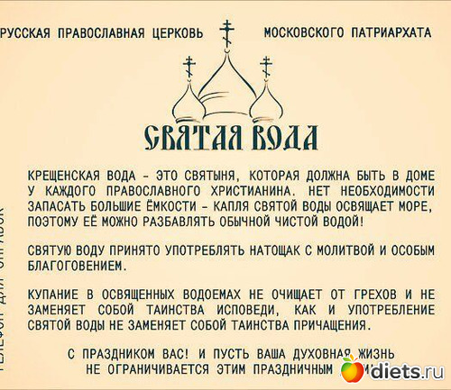«Господи Боже мой, да будет дар Твой святый и святая Твоя вода во оставление грехов моих, в просвещение ума моего, в укрепление душевных и телесных сил моих, во здравие души и тела моего, в покорение страстей и немощей моих по безпредельному милосердию Твоему молитвами Пречистыя Твоея Матери и всех святых Твоих. Аминь».