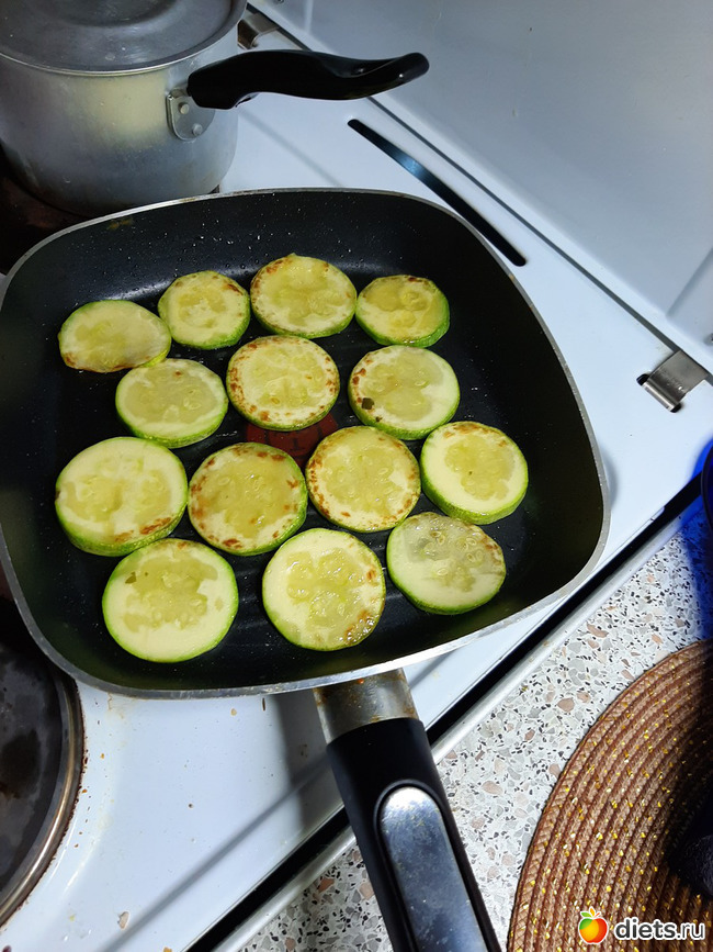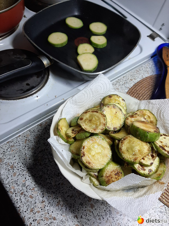 Посмотрела - кабачки темнеть начали. Замораживать влом было, поэтому поджарила на сковороде-гриле, которую кисточкой смазала подсолнечным маслом))