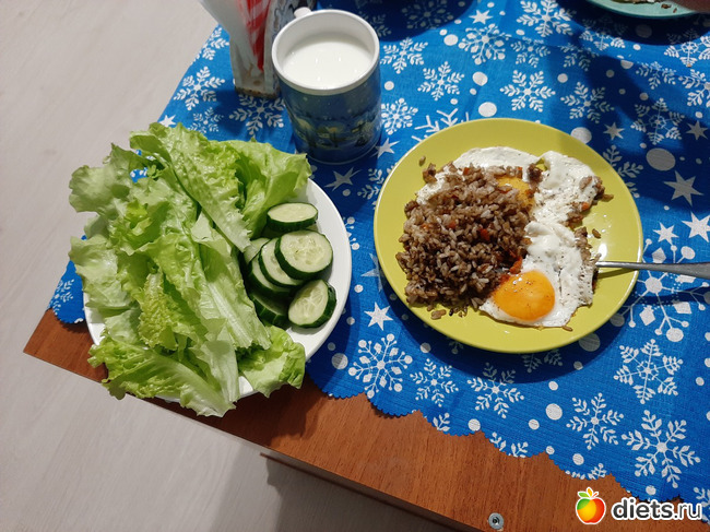 Ужин опять муж приготовил: остатки плова с яичницей))) Я добавила салат и огурец)))