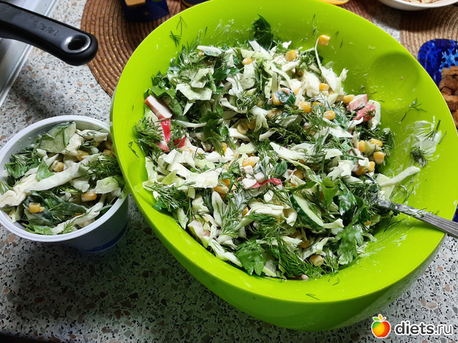 Пока тушилось - настрогала салатик: капуста белокочанная, кукуруза консервированная, крабовые палочки, укроп, петрушка, огурец. Заправка: майонез + сметана + горчица. Майонез - потому что чутка в упаковке оставалось, надо бцло использовать)))