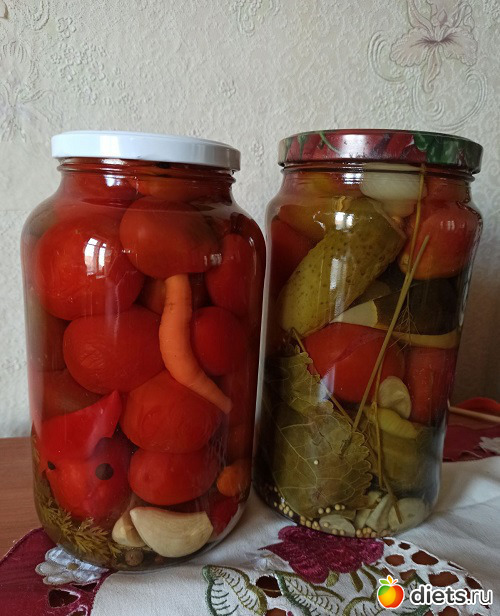 На 3 литровую банку: 1 морковка, 0,5 луковицы, 3 зубчика чеснока, 5 листьев вишни, 5 листьев смородины, 3 лавровых листа и 5 горошин душистого перца, помидоры огурцы. Все сложить в банку, залить кипятком, дать постоять 20 минут, слить в кастрюлю, 5 чайных ложек соли, 10 чайных ложек сахара, закипятить, влить 100 г уксуса, залить банку и закатать.