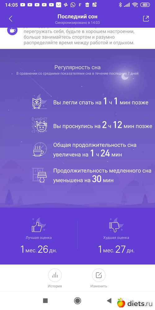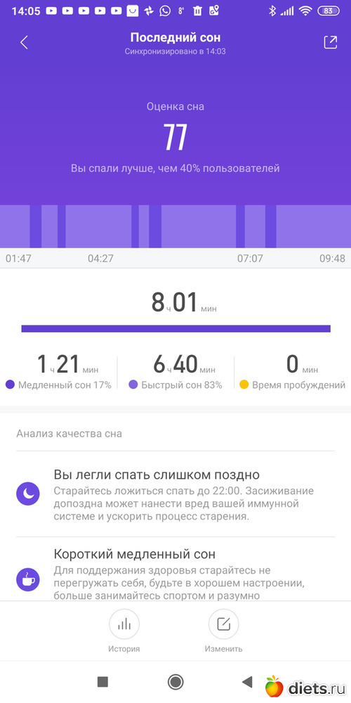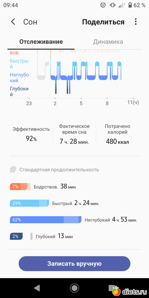 Даже у него в первый день измерения глубокий сон длился 54 минуты.