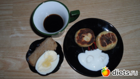 1. Завтрак (200 гр): кофе, сырники с 3 гр абрикосового варенья и сметаной; половинка яйца, мой хлеб.