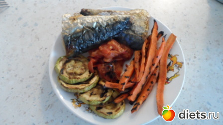 2. Обед (200 гр): запечённая скумбрия, овощи гриль: кабачок, морковь, помидоры(