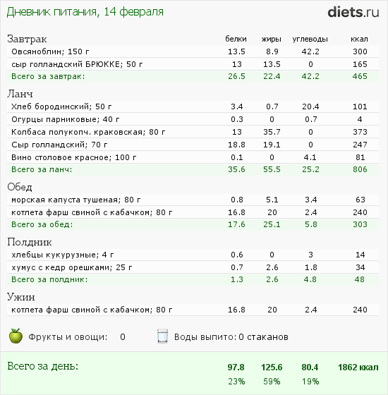 По питанию день не задался с начала ((( позавтракала сытно, потом на работе праздник ((( по калориям прикинула уже с будущим ужином - будет калорий 1800, а то и с половиной. Да, это тоже ниже нормы, конечно, но уже почти она, родимая. По разным данным (счетчикам) моя норма от 1700 до 1900 ккал. Короче, ужин будет скромный...