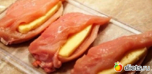 Возьмите грудку и ножом проделайте в ней отверстие, похожее на карман. Вложите в него кусочек сыра. Теперь закрепите края, чтобы сыр во время готовки не расплавился и не вылился из «кармана». Закреплять края мяса удобно с помощью деревянных зубочисток.