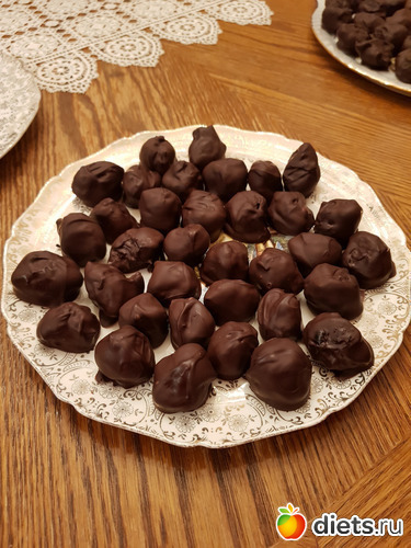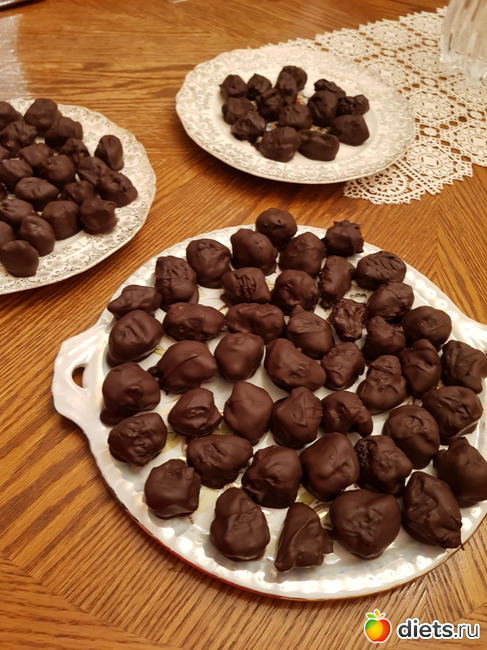 Конфеты получились: чернослив в шоколаде с начинкой с грецкими орехами, чернослив с фундуком, курага в шоколаде,