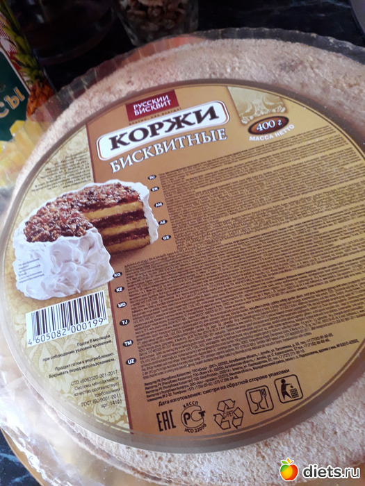 Вообще необязательно брать именно коржи, подойдет и кекс обычный, и даже кулич. Только удалите тогда всякие добавки в виде изюма, цукатов и т. д. Можно, конечно и самим испечь бисквит-но это тем, кто с ними дружит!