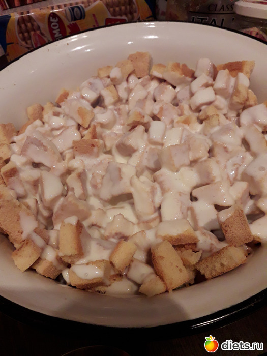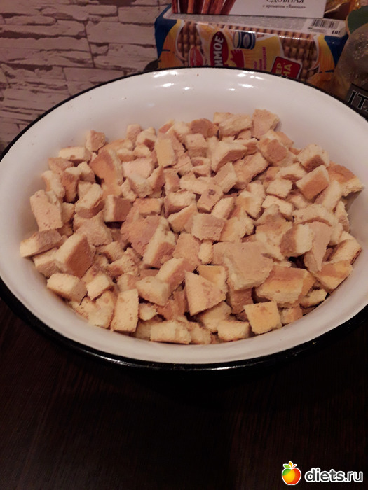 Бисквитные коржи нарезать кубиками 1х1 см, можно 1,5 см, но желательно - не больше.