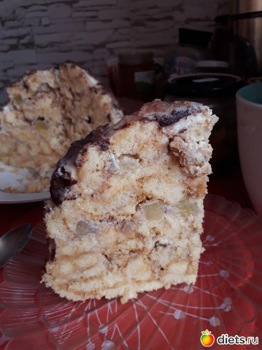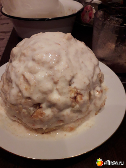 Сначала слой бисквита со сметаной, потом ананас, потом орехи и т. д., постепенно образуя конус. Постепенно собираем слой за слоем. Пока не вырастет такая горка Оставшимся сметанным кремом смазать по краям.