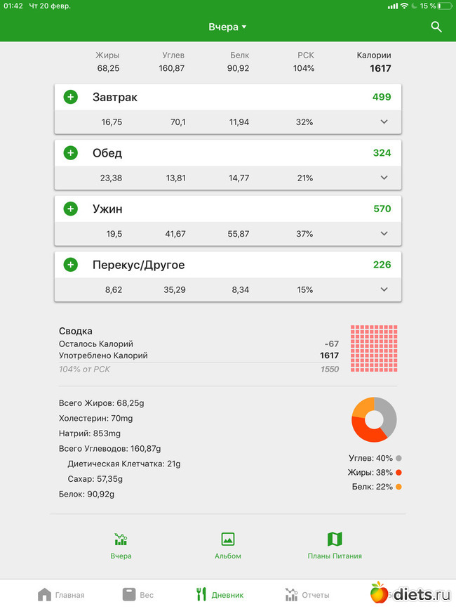 День второй, отчёт С целями на сегодня справилась, но хотелось бы все же держать калории ближе к 1500, а не по верхней границе. Вообще второй день прошёл легко. Только не очень хорошо пока считаю соотношение бжу, но стараюсь. Весь день в свободное время читала сайт, особенно, конечно, страницу до и после. Вдохновляет, что и говорить!