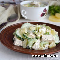 Куриное филе и ананас нарезать кубиками. Огурец и сельдерей как хотите, заправить майонезом, соль перец. Читать полностью