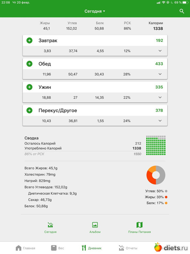 Ну что же - калории в норме. Осталось около трехсот, чтобы съесть какой-нибудь йогурт. Бжу сегодня не соблюдала, потому что не было времени готовить, ела, что дают, но в меру. Выпила пива после тяжелого рабочего дня впервые дней за 14, удовольствия меньше, чем хотелось бы... Читать полностью