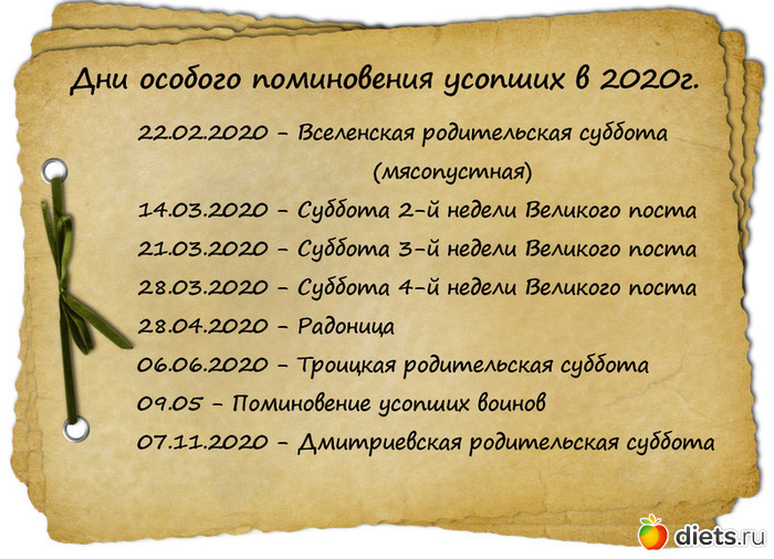 Первая родительская суббота 2020 года выпадает на 22 февраля и называется Вселенской, так как в этот день в Церкви принято поминать всех когда либо живших крещеных христиан – и близких, и незнакомых. Другое название – Мясопустная, так как ее дата привязана к началу Великого поста, и всегда бывает накануне Масленицы, во время которой по уставу уже не положено есть мясо.