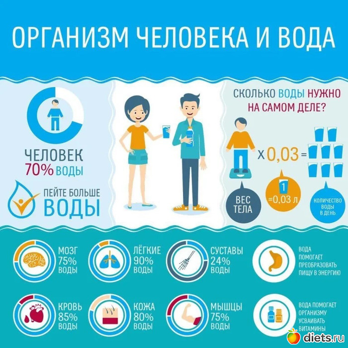 Вода высчитыается 30 мл на 1 кг веса. Это проверено!!