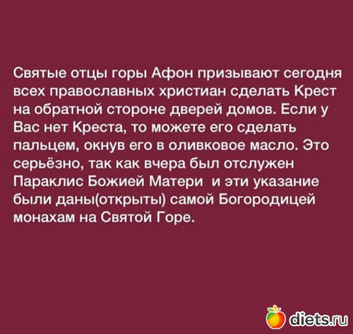 ««Монахи На Афоне молились все ночь Богородице и получили от Неё сообщение чтобы все православные повесили сегодня ( до наступления ночи)кресты на дверь входную , в дом, в квартиру. Богородица сказала всем повесить кресты. Если нет креста то тогда просто пальцем намазать на двери маслом кресты»»»