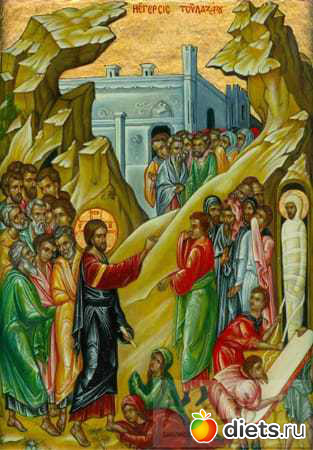Чудо воскрешения Лазаря и его выход из гроба являют собой освобождение человека от уз смерти и уверение во всеобщем воскресении и вечной жизни во Христе.