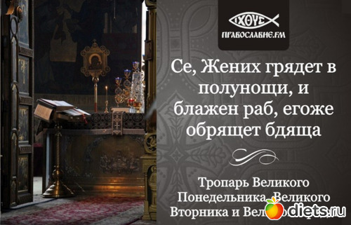 Се, Жених грядет в полунощи, / и блажен раб, егоже обрящет бдяща, / недостоин же паки, егоже обрящет унывающа. / Блюди убо, душе моя, / не сном отяготися, / да не смерти предана будеши, / и Царствия вне затворишися, / но воспряни зовущи: / Свят, Свят, Свят еси, Боже, / Богородицею помилуй нас.