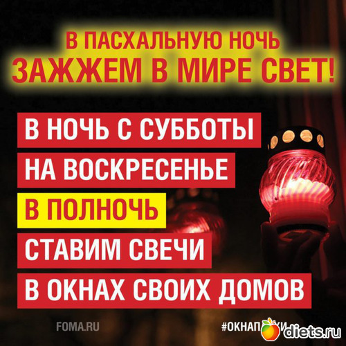 Журнал "Фома" призывает всех в пасхальную ночь с субботы на воскресенье, в полночь (!) зажечь дома лампаду или закрытую лампу со свечой, какую носим обычно на пасхальный Крестный ход, и аккуратно поставить ее на окно. Также вы можете запостить свою фотографию с вашим пасхальным окном у себя в соцстеях с хэштегом #окнаПасхи. Так мы поделимся друг со другом радостью Христова Воскресения и покажем остальным людям: где Бог – там всегда есть надежда и радость!