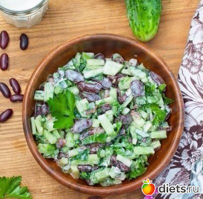 Ужин 2 (не по книге). Салат с фасолью. Увидела рецепт на просторах интернета и решила, что неплохой вариант салата в крахмальный день. Изначально в рецепте только была отварная фасоль и огурец. Я брала: