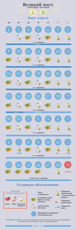 Но так как не существует отдельного устава для мирян и все изменения монастырского устава носят во многом индивидуальный характер, мы публикуем календарь, соответствующий монастырскому уставу. Он дает представление о степени строгости того или иного постного дня в церковной традиции. А уже вы сами вместе с духовником сможете определить, что для вас в настоящий момент будет являться постом — вареная картошка или диетическая рыбная котлета.