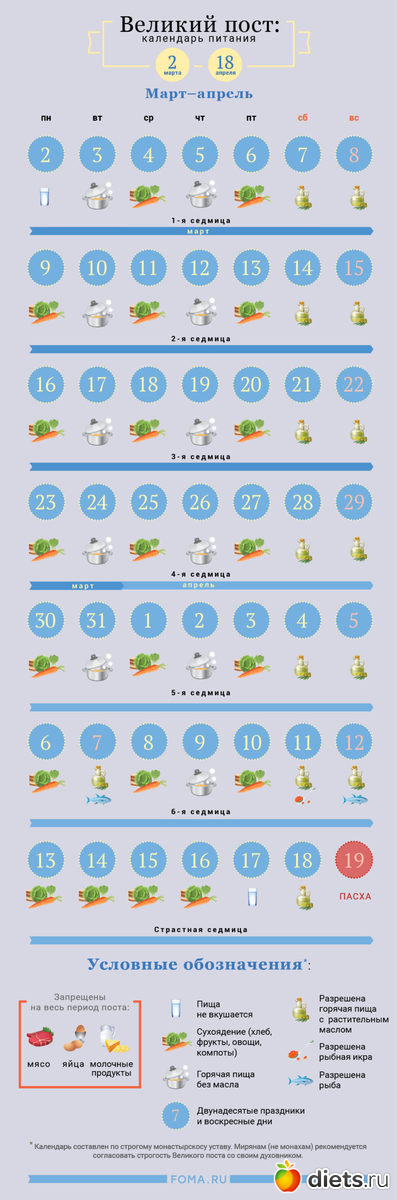 В Великий пост Церковный устав призывает отказаться полностью от пищи животного происхождения (мясо, яйца, молоко). В понедельник, среду, пятницу предписывается сухоядение (вода, хлеб, фрукты, овощи, компоты). Во вторник, четверг – горячая пища без масла. В субботу, воскресенье – пища с растительным маслом. Рыба разрешается только в дни двунадесятых праздников – Благовещение и Вход Господень в Иерусалим. В Лазареву субботу разрешается рыбная икра. В понедельник первой недели рекомендовано полное воздержание от пищи, в Великую пятницу на Страстной неделе – до выноса плащаницы.