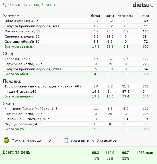 1 - питание - картинок не будет, напишу перечень продуктов и общую калорийность.