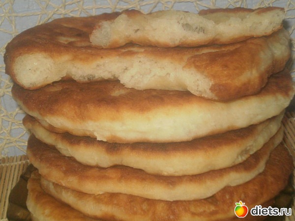 Заметки на полях:Я замешивала тесто в ХП. Для начала я насыпала 400 г муки, но при замешивании добавила еще немного до очень мягкого теста. Хлебопечку выключила раньше, чем закончилась программа, т. к. тесто норовило убежать из ведерка. Тесто получилось мягкое и липкое. На рабочую поверхность муку сыпать не стала, а смазала ее растительным маслом и руки тоже, чтобы тесто при разделке не липло. Мукой тесто забивать не стала. Лепешки получились легкие и воздушные. После жарки каждую лепешку прокладывала бумажным полотенцем, чтобы ушел лишний жир.