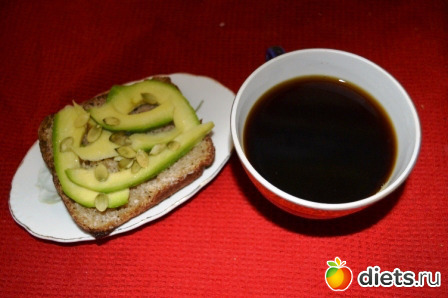 1. Завтрак: кофе, хлеб, авокадо, морская соль, лимонный сок, тыквенные семечки.
