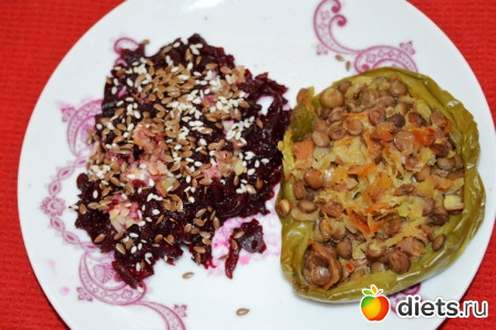 5. Ужин: салат: тёртая варёная свёкла, чеснок, кунжут, семя льна; фаршированный перец: потушила пекинскую капусту с помидоркой, добавила отварную чечевицу и острый узбекский перец(типа чили), полученной массой начинила половинки болгарского перца, положила их в силиконовую тарелочку и укрыла фольгой, отправила в духовку.
