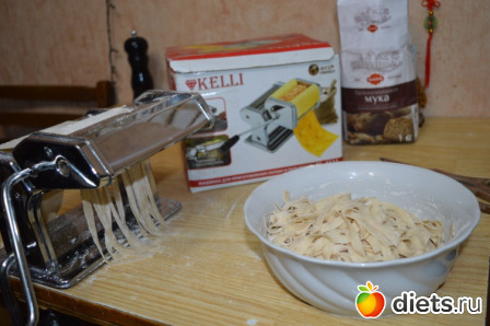 Когда заболели руки и я не могла уже вымешивать тесто, то я купила себе машинку для приготовления лапши и пельменей. Сейчас проблем с лапшой нет:хоть широкой, хоть узкой.