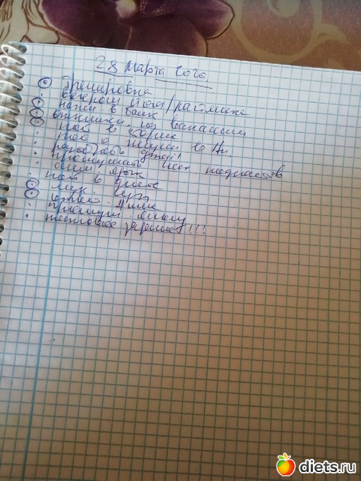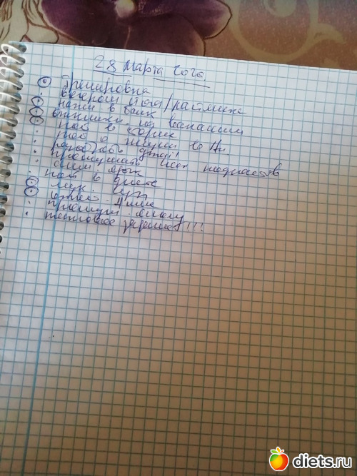 Чтобы дни проходили более-менее продуктивно, я все дела записываю в обычную тетрадь. Всё, любую мелочь. Во-первых, это разгружает голову, а во-вторых даже без какой-либо работы получается немалый список, что дает ощущение занятости. Плюс удовлетворение, когда выполненное дело обводишь кружочком.