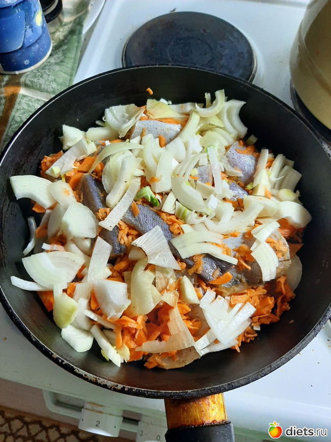 А потом стала над минтаем колдовать))) От рецепта чуть отошла (я его вчера публиковала), замариновала рыбку в специях, и потёрла 2 морковки))) Вот исходная сковородка: