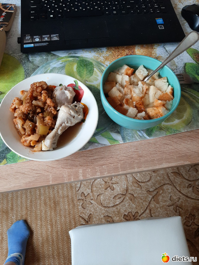 Обед: куриный бульон с сухариками, капуста с баклажанами и 2 варёные куриные голени