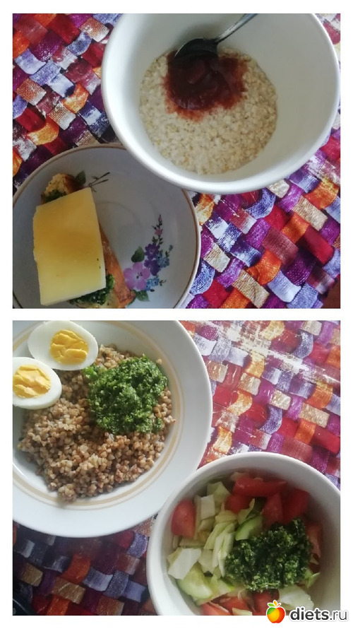 обед: греча без соли, вареное яйцо, салат из помидор, огурцов, капусты с раст. маслом, столовая ложка песто