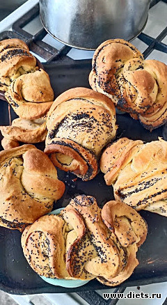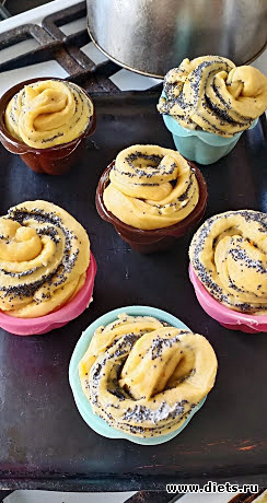 Каждую часть раскатала в прямоугольник, смазала маслом, присыпала маком, скатала рулончиком, надрезала, скрутила в краффин и положила в форму. Формочки смазала сливочным маслом.
